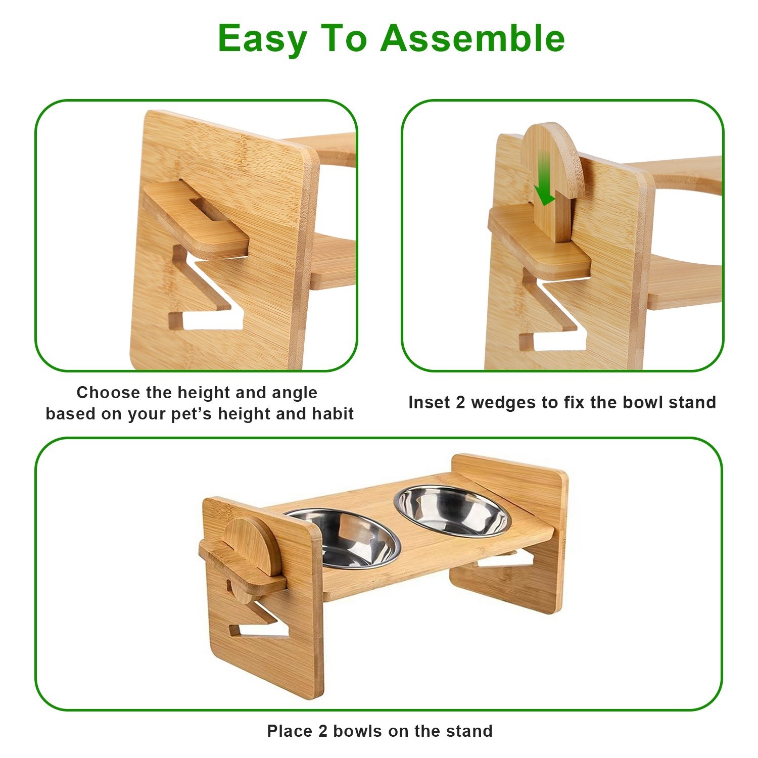Home > Bamboo Double Dog Raised Bowls 15 Degree Tilt Elevated Dog Bowls with 4 Adjustable Heights 2 Stainless Steel Bowls Pet Feeder for Dogs Cats Rabbits